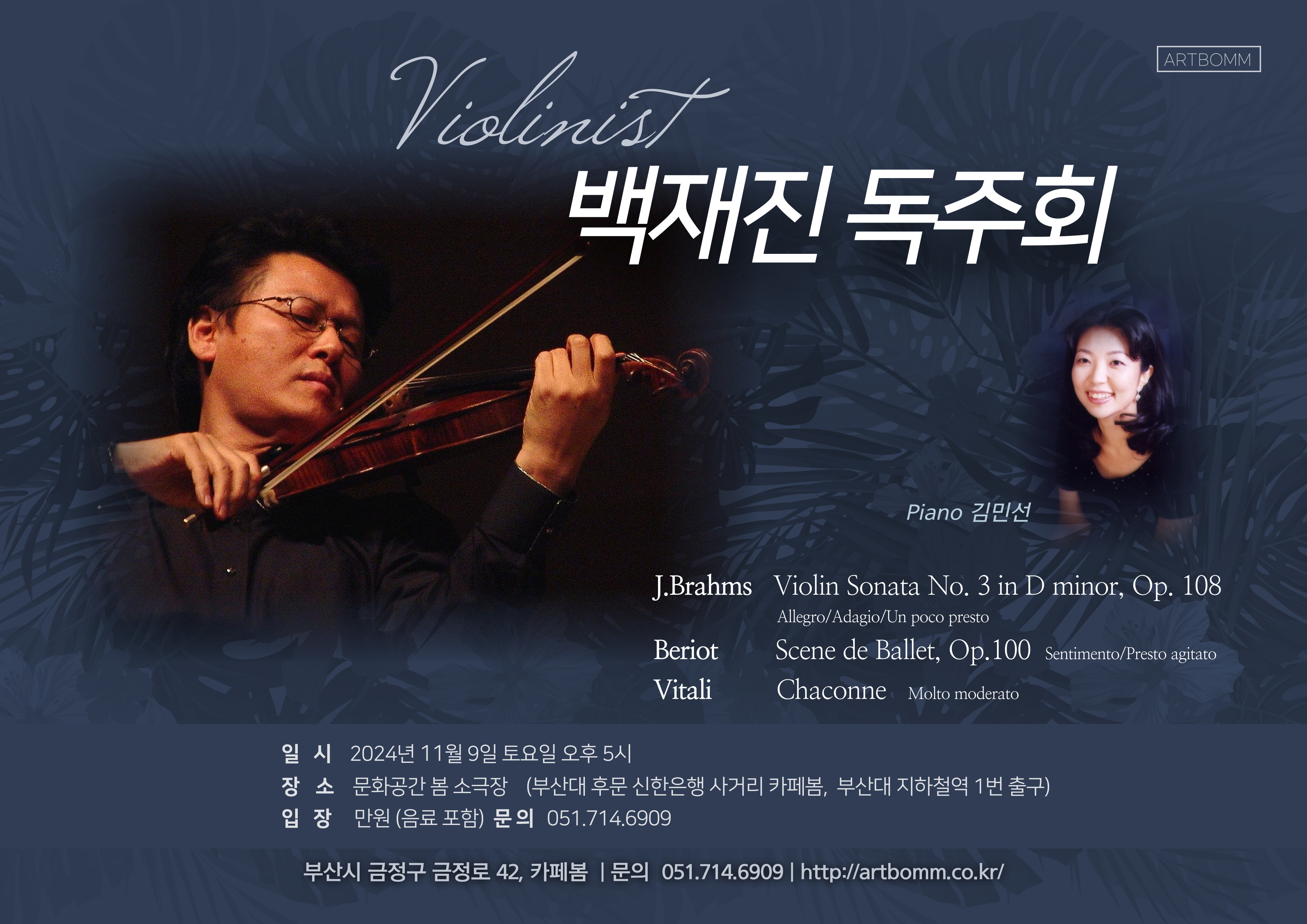 바이올린 백재진서울예원, 서울예고, 서울음대, 동아콩쿨 2위 입상 (17회, 23회), 서울 청소년 오케스트라 악장역임, 서울쳄버, 바로크 실내악단, 화음쳄버오케스트라 연주활동. 비인국립음악원. 부산시향, 대구시향, 수원시향, 울산시향, 코리아 신포니에타와 협연. 중국 천진교향악단과 협연. 베트남 호치민 심포니오케스트라 협연. 실내악단 화음, 한국아카데미쳄버 앙상블, 비르투오조 앙상블 리더로 실내악 활동. 부산시향, 대구시향, 울산시향, 객원 악장 및 솔리스트를 거쳐 울산시향 악장역임. K.B.S 한국의 음악가 시리즈에서 CD 출반. 야쿠츠에서 열린 러시아 국제 청소년 콩쿨 심사 위원 위촉. Wien Konzert House에서 비인 아카데미 쳄버오케스트라 협연. CD '내마음의 소품집', '내마음의 소품집 Ⅱ(꿈)' 출반. 부산 문화재단 이사 역임. 사사: 김진문, 박민종, 이종숙, W.Schneiderhan, G.Hetzel 현) 동의대 음악학과 명예교수, 퓨전앙상블, 부산 트리오, 비르투오조 앙상블 리더, 더날개 오케스트라 음악감독