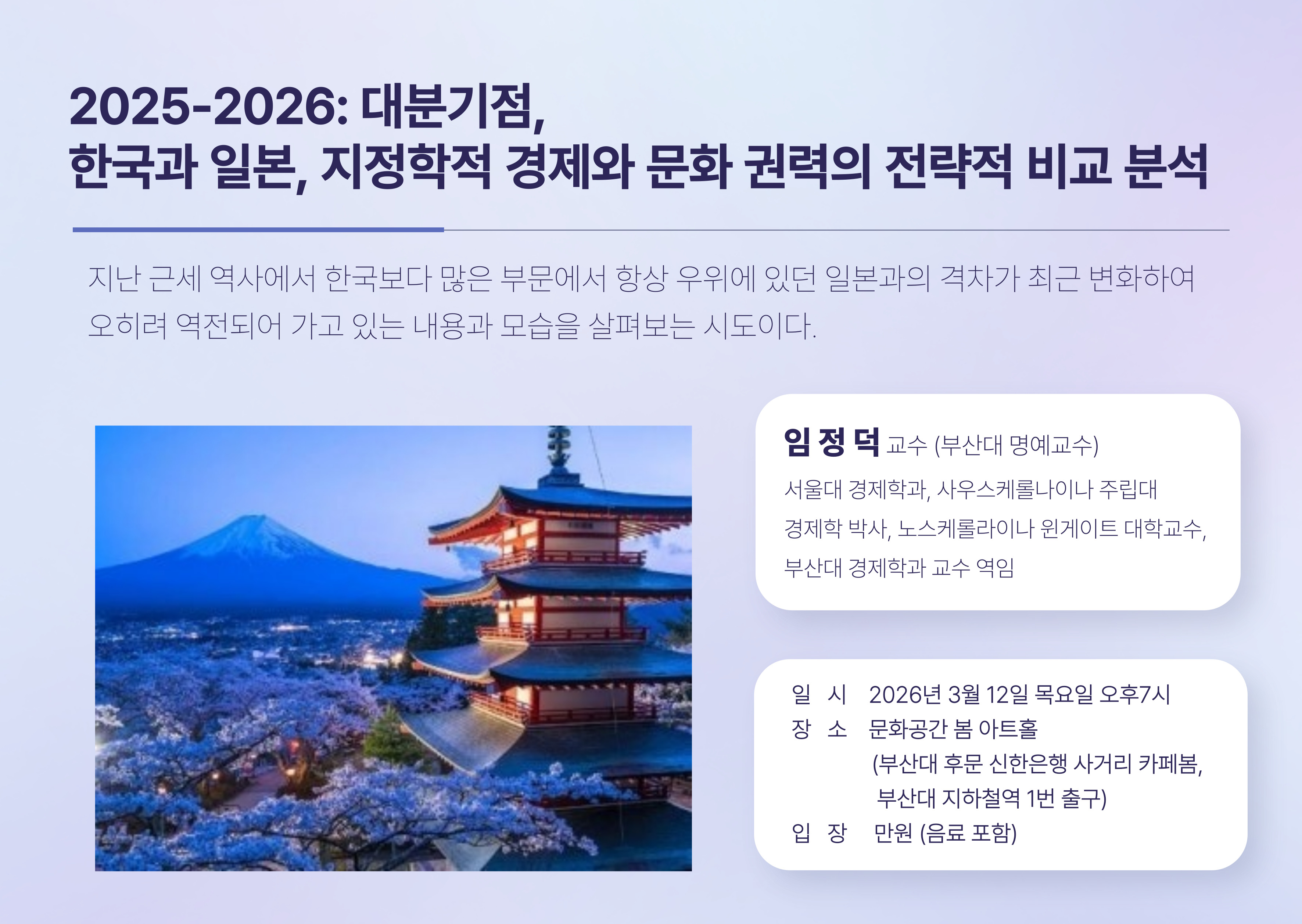 2025-2026: 대분기점, 한국과 일본,지정학적 경제와 문화 권력의 전략적 비교 분석 임정덕 교수(2026년 3월 12일 목요일 7시)