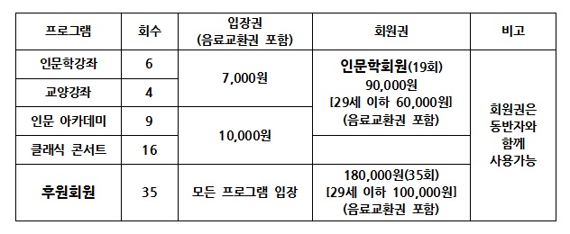 클래식 콘서트를 포함하는 모든 프로그램에 참여할 수 있는 후원회원 두 종류의 회원제를 운영하고 있습니다.