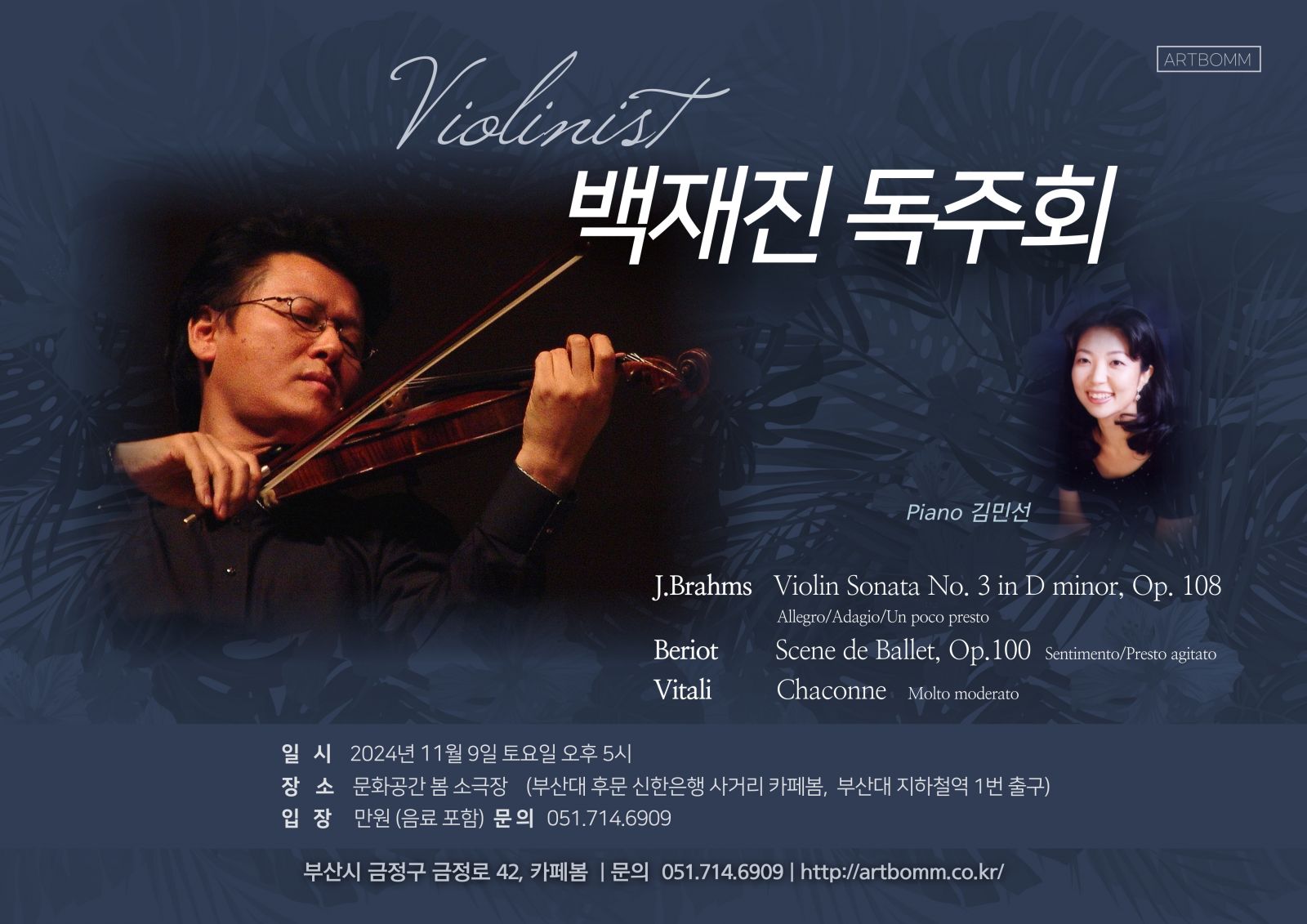바이올린 백재진서울예원, 서울예고, 서울음대, 동아콩쿨 2위 입상 (17회, 23회), 서울 청소년 오케스트라 악장역임, 서울쳄버, 바로크 실내악단, 화음쳄버오케스트라 연주활동. 비인국립음악원. 부산시향, 대구시향, 수원시향, 울산시향, 코리아 신포니에타와 협연. 중국 천진교향악단과 협연. 베트남 호치민 심포니오케스트라 협연. 실내악단 화음, 한국아카데미쳄버 앙상블, 비르투오조 앙상블 리더로 실내악 활동. 부산시향, 대구시향, 울산시향, 객원 악장 및 솔리스트를 거쳐 울산시향 악장역임. K.B.S 한국의 음악가 시리즈에서 CD 출반. 야쿠츠에서 열린 러시아 국제 청소년 콩쿨 심사 위원 위촉. Wien Konzert House에서 비인 아카데미 쳄버오케스트라 협연. CD '내마음의 소품집', '내마음의 소품집 Ⅱ(꿈)' 출반. 부산 문화재단 이사 역임. 사사: 김진문, 박민종, 이종숙, W.Schneiderhan, G.Hetzel 현) 동의대 음악학과 명예교수, 퓨전앙상블, 부산 트리오, 비르투오조 앙상블 리더, 더날개 오케스트라 음악감독